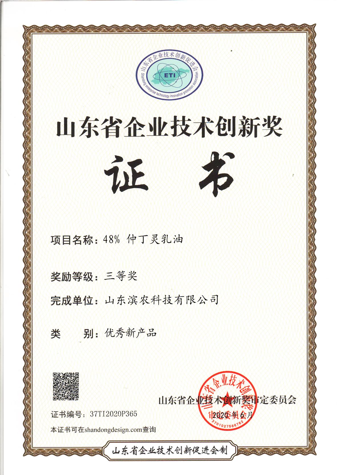 ■2021-04-08 2020-08-05 我公司新產品48%仲丁靈乳油榮獲山東省企業技術創新獎優秀新產品三等
