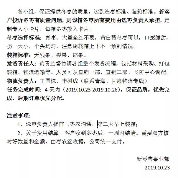 分工協作加上同事們高昂的工作勁頭,極大地提高了工作效率,歷時三天,萬箱經過層層篩選的冬棗順利發出。物流承載的不僅僅是棗,更是新零售事業部全體人員的努力付出,在這三天里,有同事早晨來不及吃早飯,只能擠出時間吃個包子,公益服務,卻也視為責任!