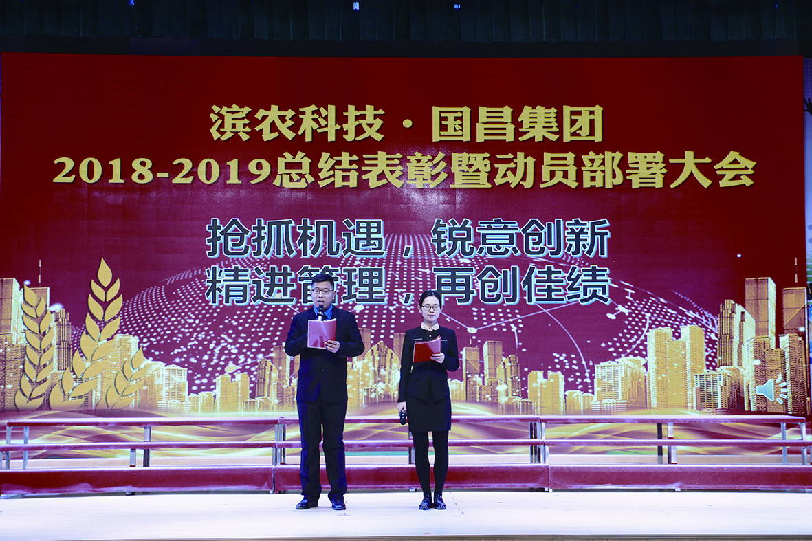 濱農科技·國昌集團2018-2019總結表彰暨動員部署大會隆重召開發布時間:2019-03-06 15:36本報訊 2月1日,濱農科技·國昌集團2018-2019總結表彰暨動員部署大會在國昌實驗學校二樓報告廳隆重舉行。國昌集團、濱農科技全體高中層管理人員及部分優秀員工代表、先進個人共400余人參加了本次大會。 大會分為四項議程,首先由濱農科技總經理張茂貴、國昌集團總經理夏毅飛分別宣讀了國昌集團、濱農科技2018年度突出貢獻獎、優秀管理者、銷售冠軍、銷售標兵的表彰決定;接著,集團公司全體高層為在2018年度做出突出貢獻的先進個人及團隊分別頒發了榮譽證書并合影留念,大會通過宣讀頒獎詞的方式,傳達了對先進工作者的肯定,也鼓舞了大家2019再創佳績的信心;隨后,國昌集團、濱農科技優秀管理者代表甕丙峰、李東,銷售明星代表于瑩、陳學付,優秀員工代表呂國強、馬曉亮先后作了典型發言。 黃總對獲獎者表示祝賀并做了動員部署重要講話。2018年兩板塊的經營業績和存在的生產經營問題做了全面總結,并分析了兩板塊2019年度的行業格局和市場環境,對2019年度兩板塊的經營目標和工作重點做了重要部署。 最后,黃總勉勵大家:時間新故相推,一往無前,奮斗接續發力,永不止步。工作既是責任,責任就是擔當。幸福是奮斗出來的,奮斗本身就是幸福,讓我們以奔跑者的姿態,奮進的腳步,實干的作風,共同書寫并綻放2019年的華彩!