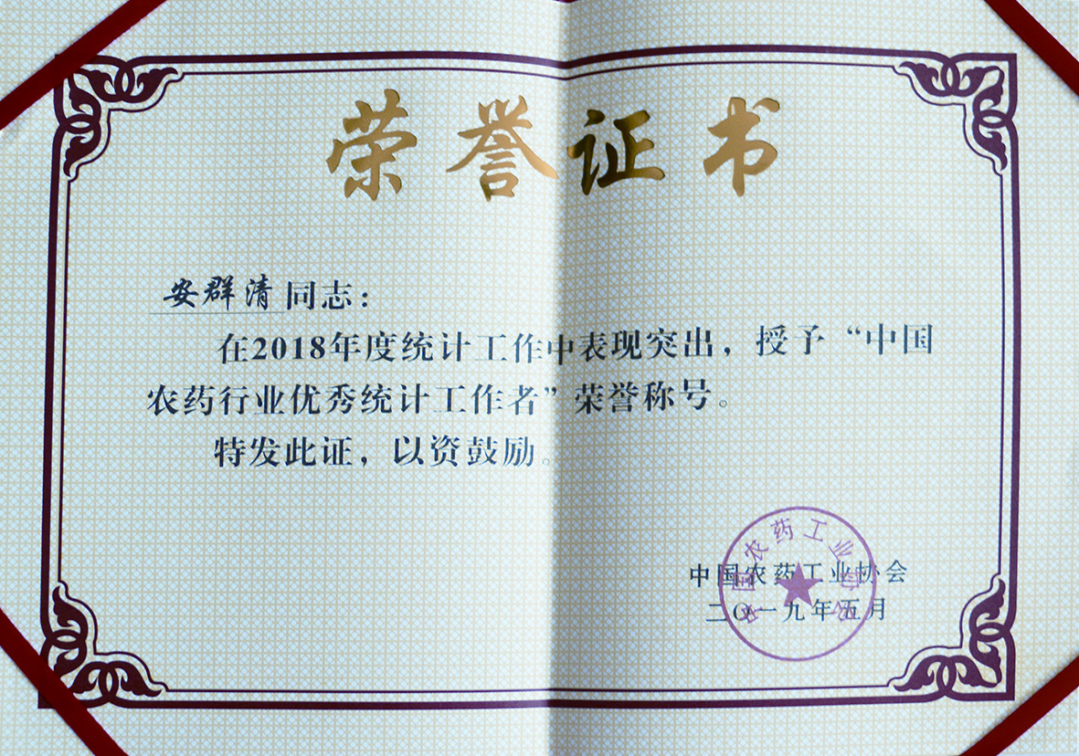 我公司安群清榮獲“中國農藥行業優秀統計工作者”榮譽稱號