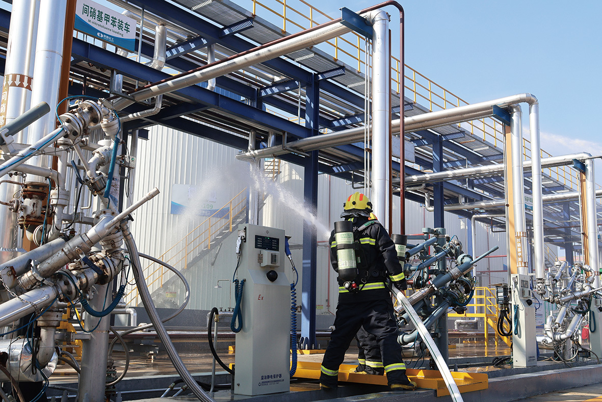 本次演練模擬1 # 罐區甲醇儲罐罐底閥泄露著火場景,現場可燃氣體報警器報警后,操作負責人立即啟動處置方案,各裝置一鍵停車; 總指揮同步啟動公司應急預案,聯系消防隊支援,并按預案分組開展先期處置、信息傳遞、聯合救援、警戒洗消、醫療救護、氣象檢測、搶險搶修及人員疏散等工作,各應急小組協同配合,順利完成演練。安全部主任孫文杰對本次演練進行了點評,郭總結合本次演練的不足之處, 要求各車間部門要進一步完善應急預案與程序,不定期開展救援演練,防患于未然。