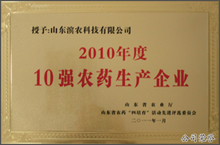 2011年1月21日,山東省農(nóng)藥檢定所召開了2011年山東省農(nóng)藥管理工作會議,會上山東濱農(nóng)科技有限公司被評為2010年山東省農(nóng)藥“四培育”活動(dòng)10強(qiáng)農(nóng)藥生產(chǎn)企業(yè)第一名。會議由省藥檢所所長楊理健主持,部所和省農(nóng)業(yè)廳領(lǐng)導(dǎo)就農(nóng)藥管理工作分別講話,并為獲獎(jiǎng)單位頒發(fā)獎(jiǎng)牌。山東濱農(nóng)科技有限公司市場總監(jiān)楊希坤代表獲得10強(qiáng)生產(chǎn)企業(yè)作了典型發(fā)言。